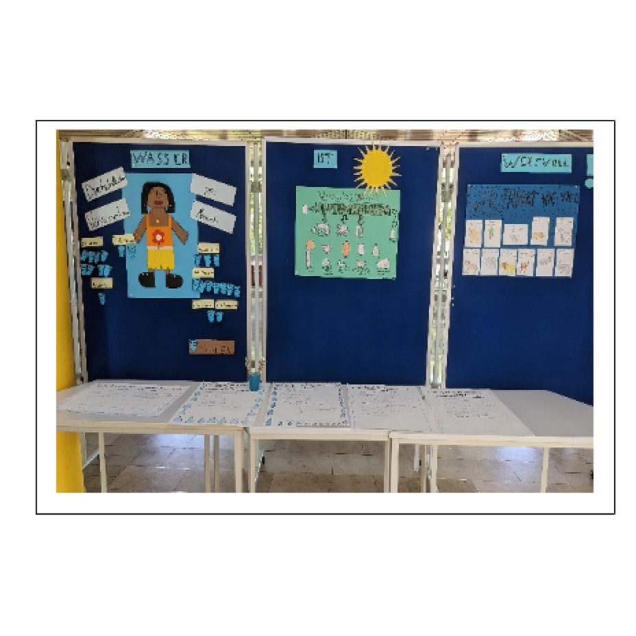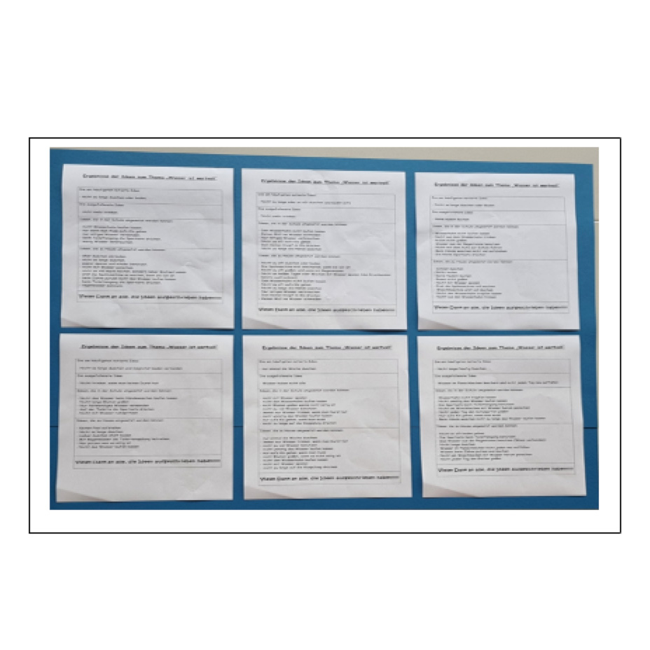 Dazu gestalteten die Schüler drei verschiedene Plakate zu oben genannten Themen. Sie setzten sich dadurch noch einmal sehr intensiv mit dem Wasserverbrauch auseinander. Die fertigen Informationen wurden in der Aula ausgehängt mit der Bitte an alle Schüler und Lehrer eigene Ideen zur Möglichkeit Wasser zu sparen aufzuschreiben.