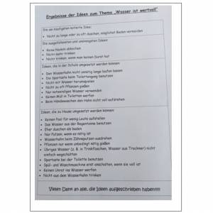 „Wasser ist kostbar“ Dieses Projektthema gehört zu beiden Handlungsfeldern, die sich die Schule im SJ 24/25 ausgesucht hat. Aufgrund des in diesem Jahr erworbenen Wissens in den Fächern Heimat- und Sachunterricht, Deutsch und Mathematik und den besorgniserregenden Beobachtungen rund um das Schulhaus und den verschiedenen Lebensorten der Schüler, kam der Wunsch auf, alle Schüler der Schule auf die Bedeutung des Wassers und vor allem auf den durchschnittlichen Wasserbedarf eines Menschen, die durchschnittliche Trinkmenge von verschiedenen Tieren und den virtuellen Wasserverbrauch aufmerksam zu machen. In Folge wurden Ideen von allen Schülern der Schule gesammelt, wie sie selbst zu einer Verringerung ihres Wasserbedarfs beitragen könnten.