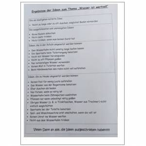 Dazu gestalteten die Schüler drei verschiedene Plakate zu oben genannten Themen. Sie setzten sich dadurch noch einmal sehr intensiv mit dem Wasserverbrauch auseinander. Die fertigen Informationen wurden in der Aula ausgehängt mit der Bitte an alle Schüler und Lehrer eigene Ideen zur Möglichkeit Wasser zu sparen aufzuschreiben.