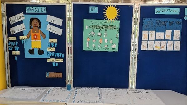Dazu gestalteten die Schüler drei verschiedene Plakate zu oben genannten Themen. Sie setzten sich dadurch noch einmal sehr intensiv mit dem Wasserverbrauch auseinander. Die fertigen Informationen wurden in der Aula ausgehängt mit der Bitte an alle Schüler und Lehrer eigene Ideen zur Möglichkeit Wasser zu sparen aufzuschreiben.