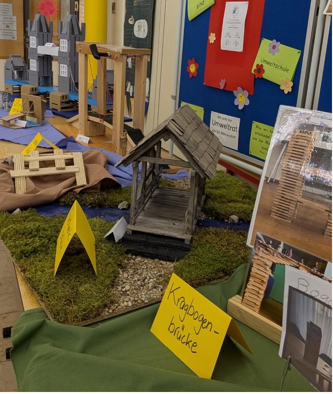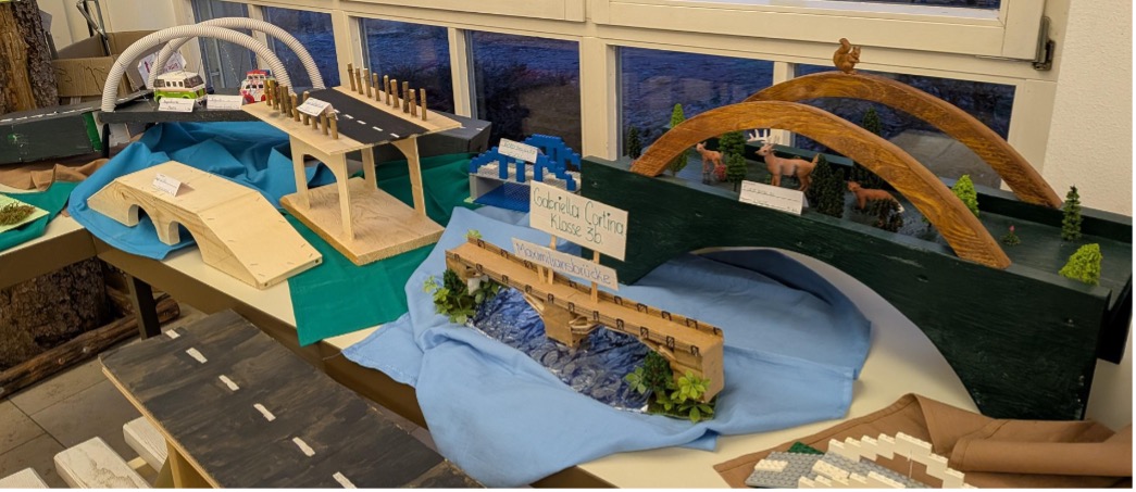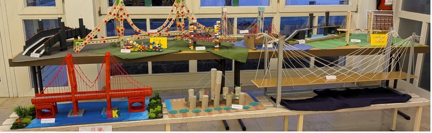 Wir besitzen tolles, neugierig machendes Unterrichtsmaterial, wie z.B. zwei verschiedene Modelle der berühmten DaVinci Brücke. Brückenforscherboxen mit unendlichen Konstruktionshilfen und -anregungen, usw. Um die Schüler in ihrer Kreativität anzuregen, auf ihre Umwelt und deren Möglichkeiten aufmerksam zu machen, haben wir vor einiger Zeit angefangen, Brückenausstellungen mit Brücken zu machen, die die Schüler zu Hause selber mit oder ohne Hilfe entwickelt haben. Da gibt es ganz einfache, aber liebevoll gebaute Brücken, aber auch hochkomplizierte Brücken. So oder so. Alle gebauten Exemplare sind sehenswert und machen Lust auf mehr.