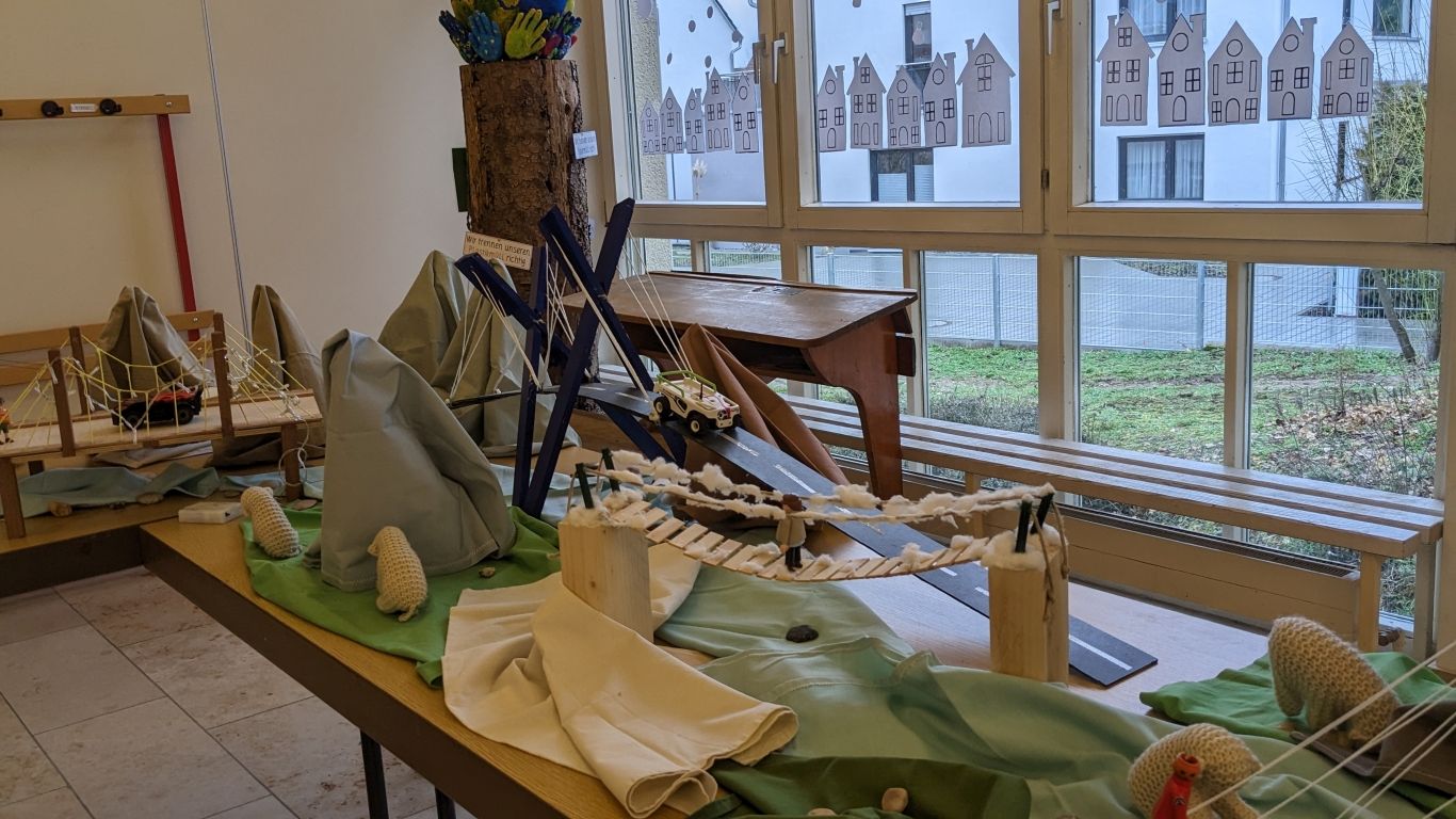 Wir haben in der Aula Tische aufgestellt, um eine Ausstellung vorzubereiten. Mit Tüchern wurden Landschaften gemacht und mit Playmobilmännchen dekoriert.
