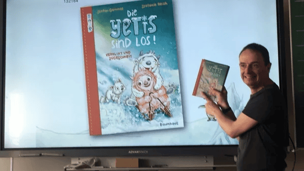 Herr Gemmel las aus seinem Buch „Die Yetis sind los“ vor: Im Yeti-Tal gibt es nichts als Eis und Schnee. Hier ist alles weiß- bis auf das Fell von Yeti- Mädchen Rosa…